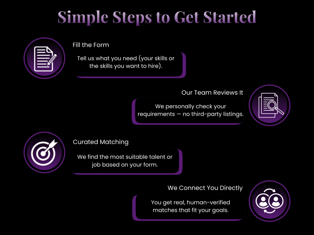 Tell us what you need — your skills or hiring requirements — and we’ll connect you with the right people up to 3× faster, no marketplace noise.